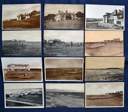 Interesting selection of Dornoch and Royal Dornoch Golf Club and Golf Course golfing postcards from the early 1900s onwards (12) to include The Club House, 12th Green, 13th Green with players putting out with spectators, Dornoch Hotel together with other views of the course - 3x used with dates ranging from 1912, 1920, and another 1956 published by C M Gillespie Dornoch, M and L National Series, Davidson's Carbon Series, Valentines