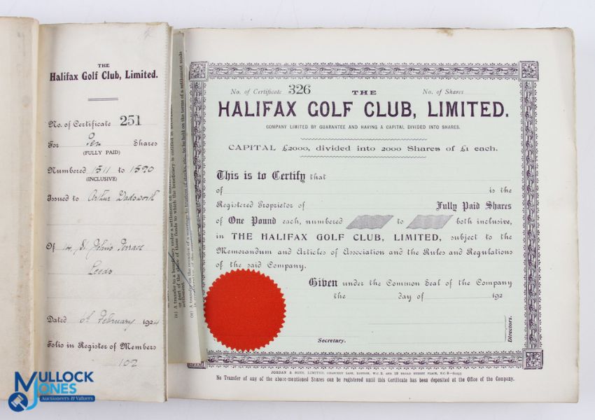 1924 Halifax Golf Club Ltd Share Certificate Book, No.251/500 with the first 75 issued to members from 1924-1956