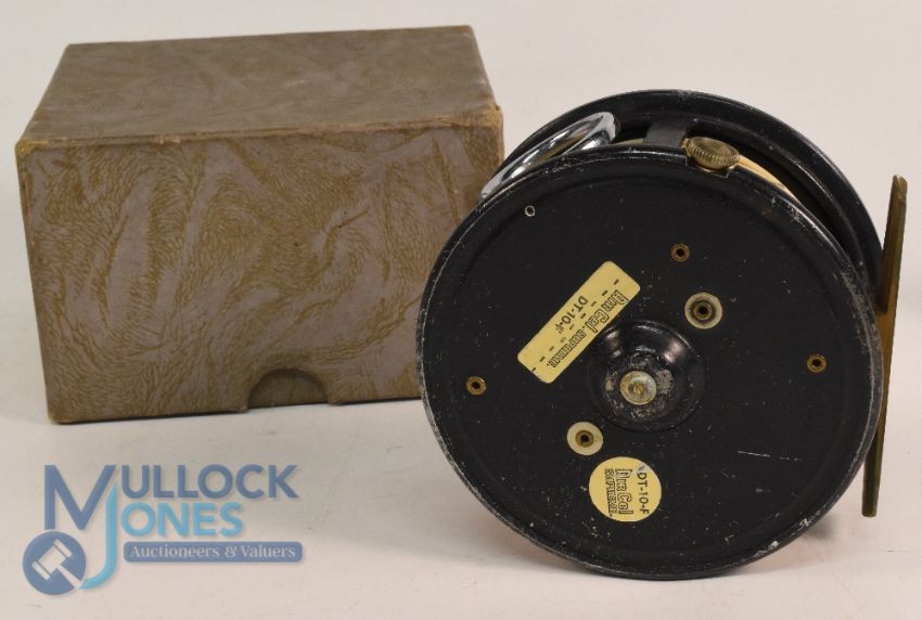 S Allcock & Son Redditch "The Marvel" alloy salmon fly reel 4" wide ventilated spool with 2 screw latch and white handle, milled rim tensioner, strong constant check, nickel silver line guide, 3 screw brass foot. In correct box, light rim wear, runs well