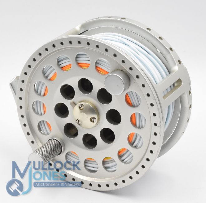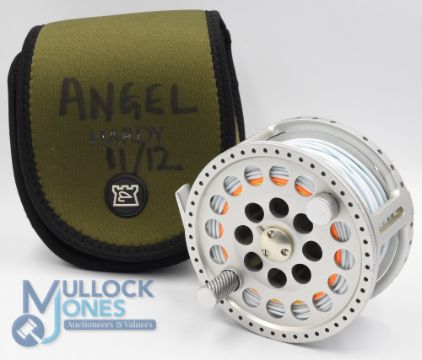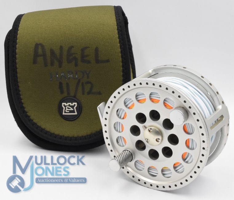 Hardy Bros "The Angel" 1112 No 4891 alloy salmon fly reel - 4 3/16" wide ventilated spool, 3 screw latch, engine turned counter balanced handle, large rear spindle tensioner, ported reel seat. Original neoprene pouch and instructions. Very light use, fine example