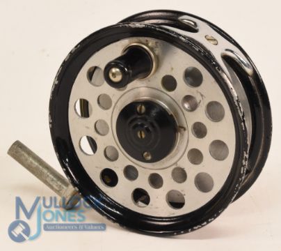 A scarce Allcocks "Argus" alloy trout reel with factory fitted Argus Rod attachment, 3 1/4" ventilated spool, 2 screw latch, black handle, constant check, runs well