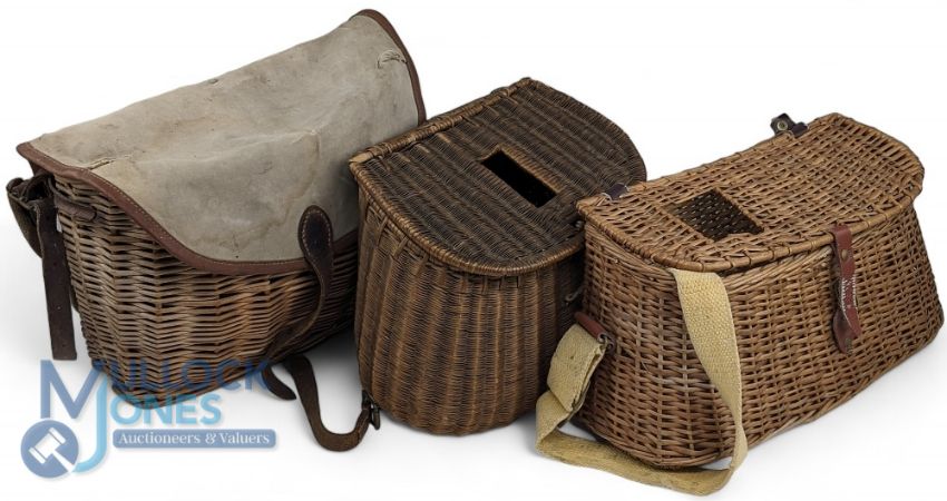 3x Wicker and Split Cane Fishing Creels, to include a Brady creel with canvas liner, webbing shoulder strap with leather edging, a period split cane creel, and a more modern wicker creel - its shoulder strap part loose (3)