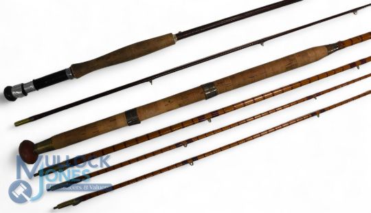 S Allcock & Sons Redditch "The Gunner" split cane salmon fly rod - 12ft 6" 3pc with spare tip, 24" handle with alloy sliding reel fittings and brass collars, red agate butt/tip rings, twist lock joints, MCB. Looks original. A E Rudge & Son Redditch hollow glass trout fly rod - 8ft 2pc alloy uplocking reel seat, red agate butt/tip rings, cloth bag. (2)