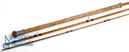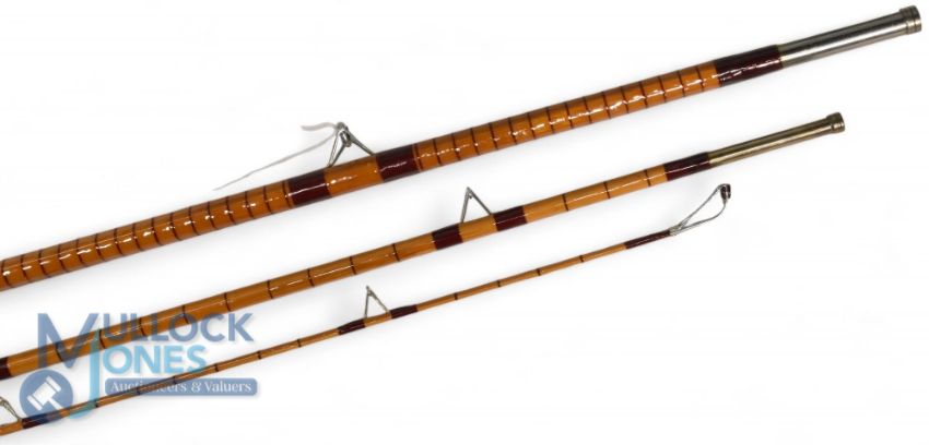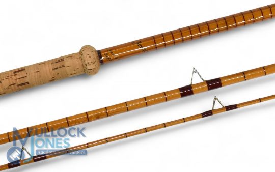 B James Avocet 11'6", 3 piece split cane rod, lightly restored, burgundy close whipped, high bells guides, red agate butt/tip liners, bronze shoulder ferrules, 24" doughnut cork handle with light alloy reel rings, fine condition classic rod, no bag.
