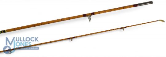 Allcock New Superb 10' 2 piece split cane carp rod, Burgundy close whipped, low bridge guides, bronze push ferrule, 30" cork handle with sliding alloy reel rings, clean rod, in MOB.