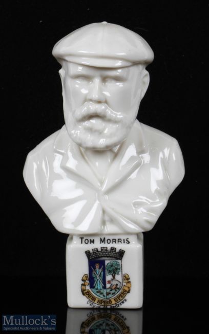 Fine and large Tom Morris St Andrews head and shoulder Bust Figure Souvenir Ware - stamped Willow Art China Longton (The Potteries) to the base and Hewitt Bros impressed on the reverse - mounted on square rectangular base with City of St Andrews Crest - overall 6". Note: Golf Collection from "David Easby Estate"
