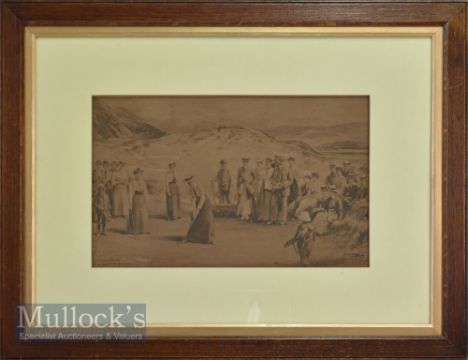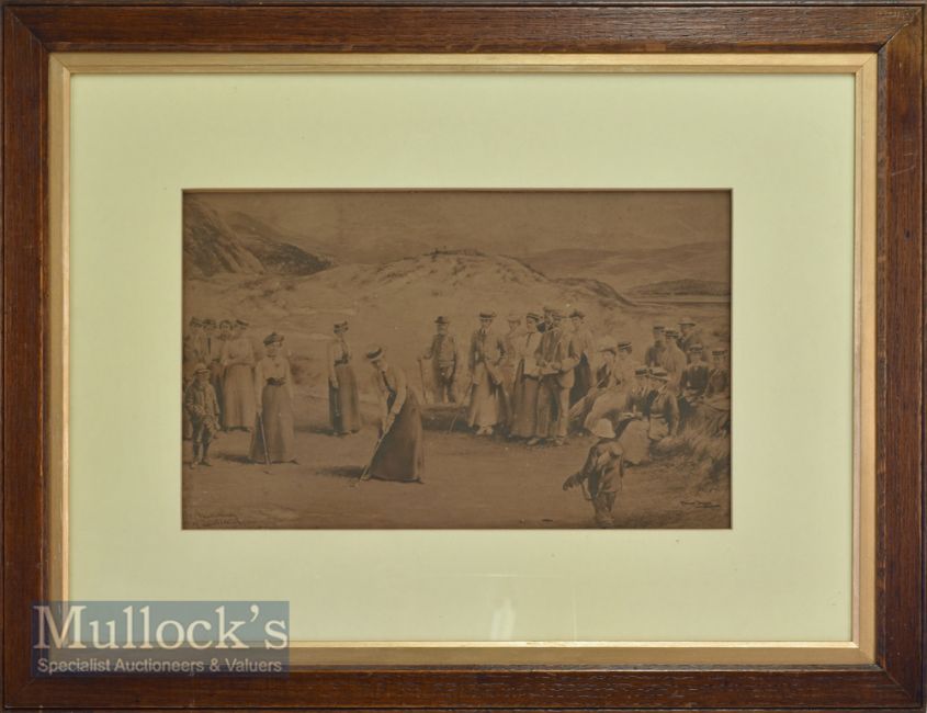 Michael Brown Life Association Aberdovey: Ladies Golf Championship 1901 golf print - used for Life Association of Scotland 1902 calendar mounted framed and glazed complete with gilt slips overall 20|x 25.75 - heavily discoloured (Not suitable for posting)