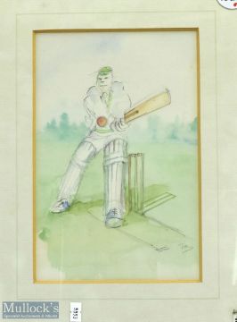Cricket Batsman in Motion Pencil Drawing with colour wash signed Tim, framed, and mounted under glass - size #36cm x47cm