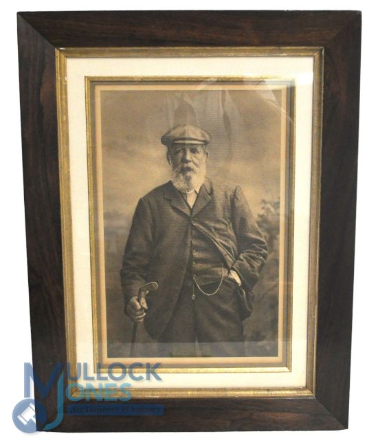Golfer Tom Morris 1821-1908. Lithographic photograph standing hold his golf club f&g with gold trim mount in dark wooden frame 54 x 42cm