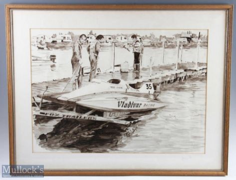 Roger Jenkins Formula 1 Powerboat Racing Champion, monocolour watercolour painting at is believed to be a scene at Ullswater c1984, large framed under glass 88cm x 68cm (Not suitable for posting but can be removed from the frame)