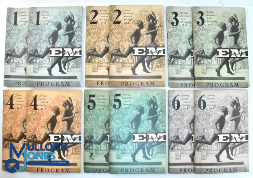 Twelve Stockholm Sweden 1958 European Athletic Championships programmes - All 6 days programmes x2, good condition with some results noted in centre