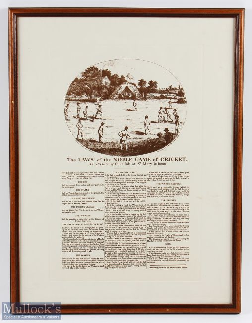 The Laws of the Noble Game of Cricket reproduction print of original dated 1809, as revised by the Club at St Mary-le-bone, with early cricket scene above rules below, framed measures 40x53cm