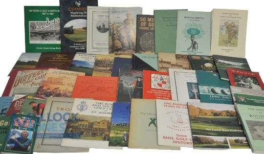 Golf Books and Booklets To include many Club Histories Coxmoor, Chart Park, Ben Sayers, Hunter GC, Carnoustie, Stanton on the Wolds, Pau GC, Westwood GC, 110 Golf Matches Oxford v Cambridge 1878-1999, Royal Liverpool GC, Nairn GC, Scrborough (box)
