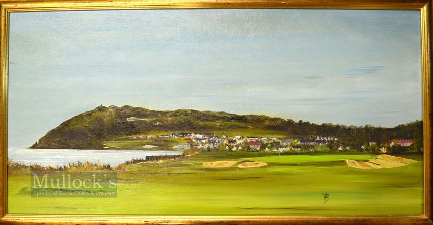 Brendan Hayes (Modern Irish Artist) - signed oil and acrylic on canvass titled "Bray from Woodbrook Golf Club" Co Wicklow, Dublin - signed lower right - c/w artist hand written details, signature and date 1980 to the rear wooden stretcher - overall 23" x 43"