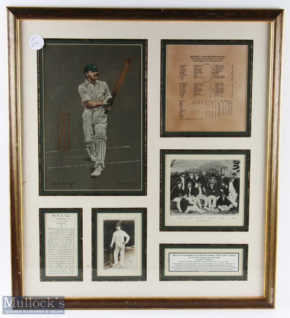 1902 Australia v England R A Duff 6 Aperture display, to include a period postcard, team photograph a Cricket Print of R A Duff by Chevallier Tayler, with modern scorecards, framed under glass - size #67cm x 78cm (not suitable for posting)