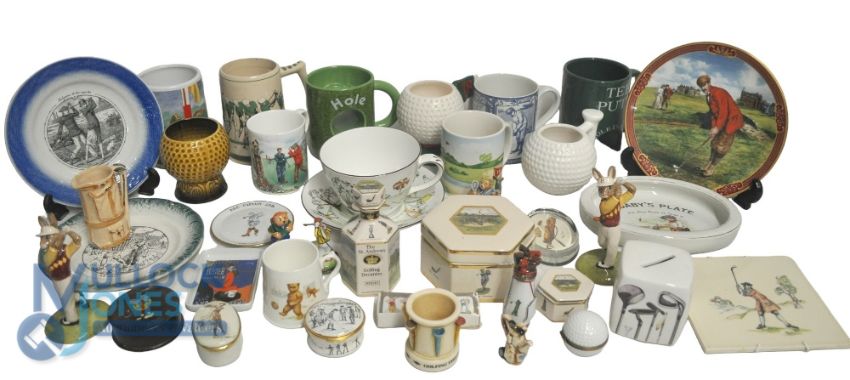 Golf Related Ceramics and Trinkets. To include Ornaments, Figures, Trinket boxes, Plates, Moneybox, together with a quantity of Mugs (2 boxes)