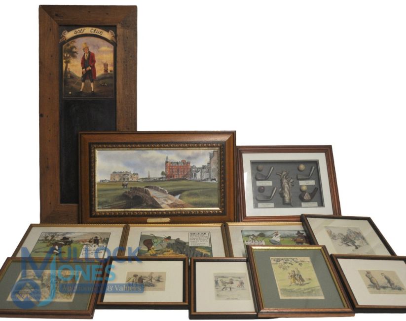 Golf Prints. 6 Modern Crombie prints, 9 Early Hand-coloured Lithographs together with Golf Display, Golf chalk board, large print all framed (box)