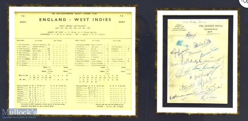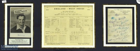 1957 Signed framed England v West Indies Display of Tom Graveney - photograph, scorecard and hotel headed paper. Tom Graveny scored 258 in this match. The Queen Hotel is signed by the West Indies team, framed and mounted under glass, size #37cm x 80cm (Not suitable for posting)