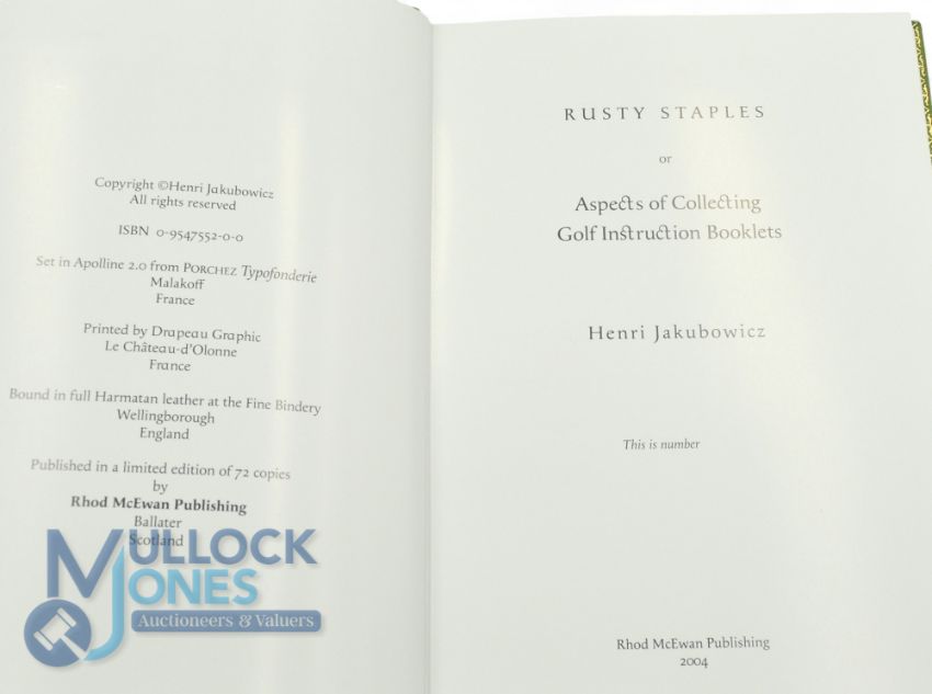 Rusty Staples or aspects of Collecting Golf Instruction Booklets. 2004 by Henri Jakubowicz limited edition of 72 copies of which this is copy has not been signed in green leather and slip case comes with letter to say Autor would sign later but didn't