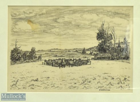 Kings Burton Cricket Club pencil etching by cartoonist Sillince, original drawing frame and mounted under glass, size 47cm x 39cm