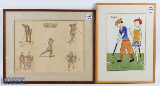 2x Interesting Golf Fashion Drawings - watercolour titled "Fore" dated and initialled on the reverse "J Lo 30/8/1929" possibly for a magazine front cover overall 18x 13.5"; and another titled 'Golfing Costume' featuring 5x golfing figures from Victorian times to early 1900s each numbered and signed lower left corner and dated 1927 mf&g overall 16.75 x 20.5".