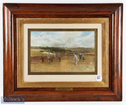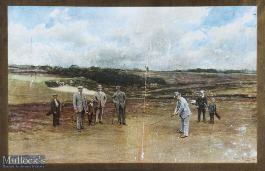 Michael J Brown (after) Life Association Colour Golf Print - Walton Heath Golf Course - featuring players James Braid, Lloyd George et al - vertical crease and other marks - image 10" x 15" - mf&g overall 21.5x 26.25" - From the late David Easby Estate