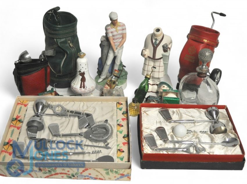 Golfing Drink Related Memorabilia. To include Decanters featuring golfers, Golf Bag wine holders, Miniature Golf ball Whiskey bottles and Golf trolleys, Bar sets (box)