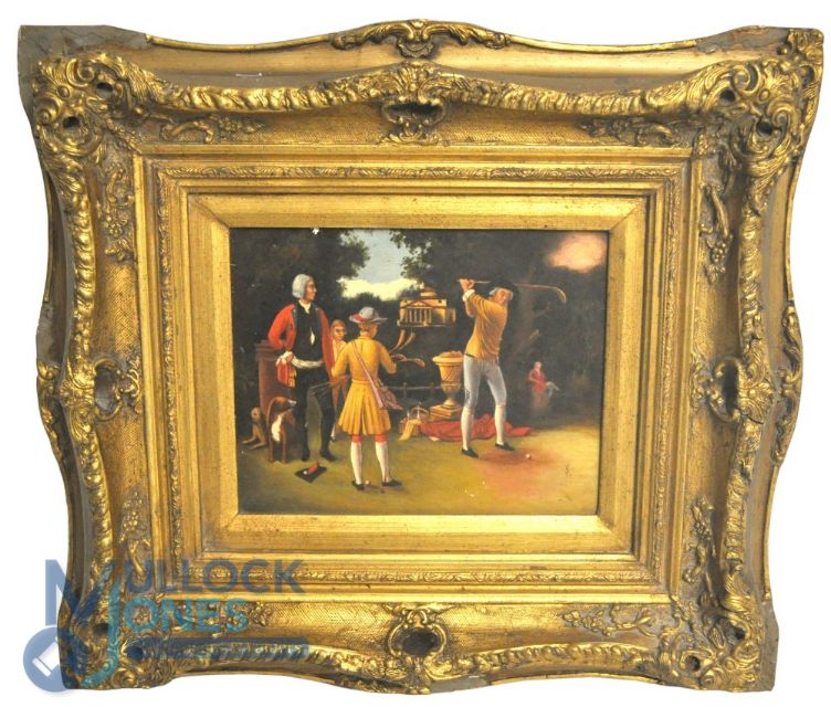 Reproduction 18th Century Golf Painting. Printed to look like a Oil painting on board in a heavy gilt ornate frame with Biggs & Sons Picture Restorers label 50 x44cm (note some damage to frame)