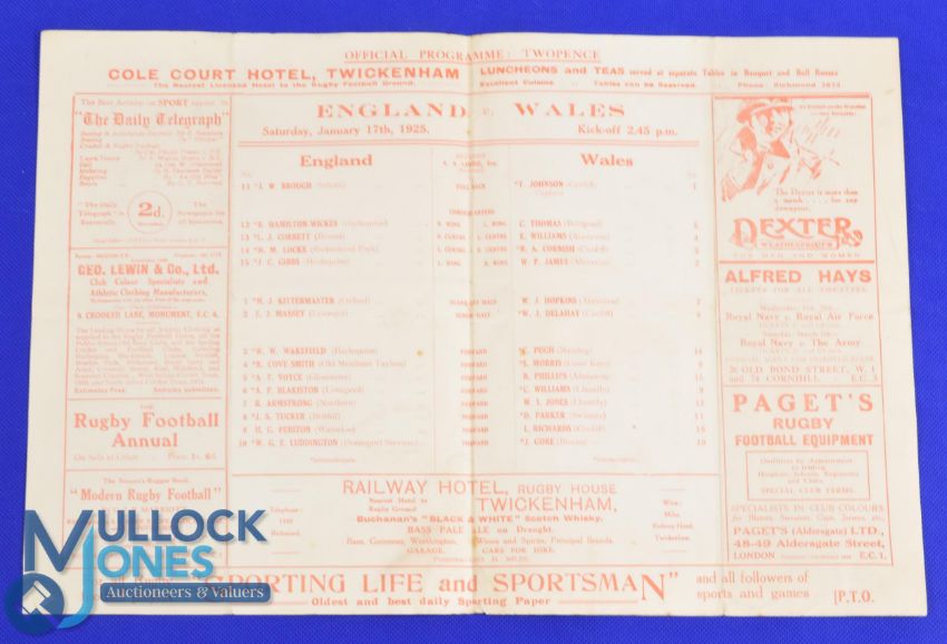 1925 England v Wales Rugby Programme: The old 'newspaper foldout' Twickenham style issue, VG