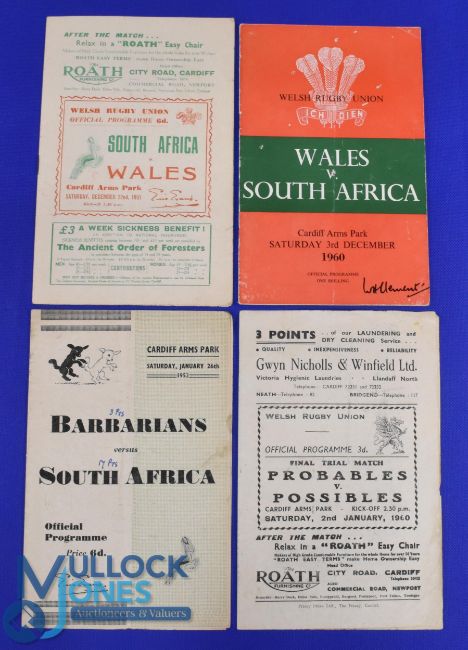 S Africa in Wales etc Rugby Programmes 1951-1960 (4): The 'Boks v Wales 1951 and 1960 (p/h but signed by 6 S Africans) and v Barbarians 1952 (rear cover grubby), plus Jan 1960 Final Welsh Trial at Cardiff, worn inside. Otherwise G