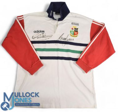 1997 British and I Lions white Official Training/Leisure Jersey Signed by Austin Healey and Ieuan Evans: Large Adidas, mainly white, official issue, with contrasting colour bands of the other home nations to the chest, and all the correct sponsors', makers' and Lions' logoes. Signed to front by Ieuan Evans and Austin Healey. VG