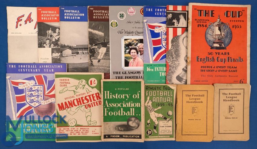 Selection of football publications to include 1948 Official History of Manchester United Famous Football Clubs edition, The Football League Handbooks 1941/42 (20 Clubs not playing league games), 1944/45 (13 Clubs not playing), 1944/45 Athletic News football annual, 1948 History of Association Football by Findon, The FA Cup 50 years of FA Cup finals 1884 - 1933 Jubilee Edition (1st edition), 1951 Day and Mason FA Cup photographic annual (32 pages), FA Bulletins November 1954 (Moscow Dynamo v Arsenal on cover), September 1955 (results of FA XI West Indies tour), April 1956 FA Amateur Cup final, December 1956 FA Youth Cup results 1963 FA Centenary year - Youth Cup tournament programme; fair. (A Lot)
