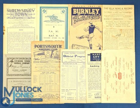 Selection of 1940s football programmes to include 1945/46 Manchester City v Stoke City, 1945/46 Chelsea v Charlton Athletic, 1945/46 Manchester Utd v Bradford Park Avenue, 1946/47 Portsmouth v Bolton Wanderers, 1946/47 Swindon Town v Aldershot, 1946/47 Aston Villa v Huddersfield Town, 1947/48 Burnley v Derby County, 1948/49 FA XI v RAF XI (at Arsenal), 1949/50 Shrewsbury Town v Hull City (Midland league); fair. (9)