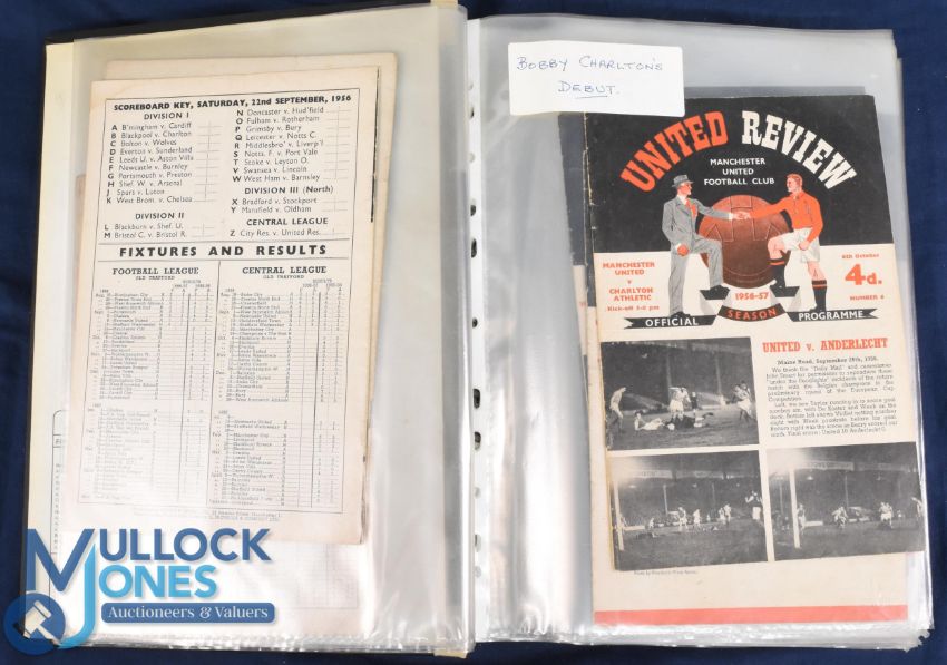 Collection of Manchester Utd home programmes to include 1956/57 complete league (less Birmingham City and Portsmouth) (19) plus Everton (FAC) (approx. half tokens missing); 1957/58 complete league season (21) plus Ipswich Town (FAC), WBA (FAC), Aston Villa (Charity Shield) (most tokens missing); 1958/1959 complete league season (21) plus Young Boys (friendly), Wiener SC (friendly) most tokens intact, also 1968 European Cup final programme; 1959/60 complete league season (21) plus Sheffield Wednesday (FAC); 1960/61 complete league season (21) plus Real Madrid (friendly), Bayern Munich (friendly), Sheffield Wednesday (FAC), Exeter City (FLC), 1961/62 complete league season (21) plus Bolton Wanderers (FAC), Arsenal (FAC), Arsenal again (FAC), Sheffield Wednesday (FAC) and Football League v Italian Football League. Also Manchester Utd big match programmes FAC final 1990 + match tickets (2), FAC final replay 1990 + match tickets (2), Rumbelows Cup final 1991 + match ticket (1), 1991 Cup final ITV Sport issue, 1992 Rumbelows Cup final 1992 + match tickets (2), 1992 R. Cup final ITV Sport, Coca Cola Cup final 1994 + match ticket, FAC s/f 1994 v Oldham Athletic + match ticket, FAC s/f 1994 replay + newspaper match report, FAC final 1994 + match ticket + newspaper match report; also a further bundle of 1970s/1980s United home programmes (approx.. 50); overall fair/good. (4 folders)