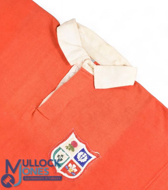Probably 1960s British and I Lions Matchworn Rugby Jersey: Classic scarlet, Umbro make supplied by Forsyth's, lovely Lions' 4 home countries badge, white plastic no.7 to rear, appears to have been badly and partially re-sewn on, too high on back! VG condition
