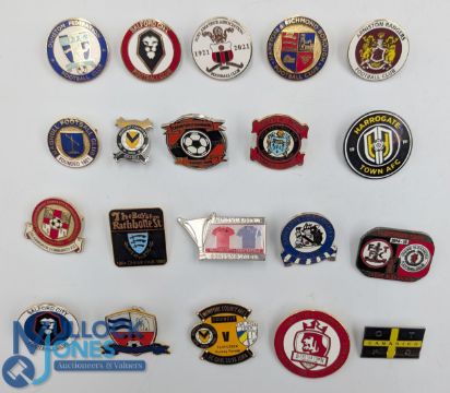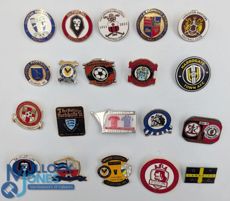 20x Mainly British Non-League metal and enamel Football Badges, with teams of Hamton and Richmond, Radcliffe Borough, Fleetwood Town, Newport County, Dunston Federation, Hyde, Salford, Silksworth, Grays Athletic, Arniston Rangers, Bury Amateurs, Maghull Harrogate Town, Carnforth Rangers, Newport County