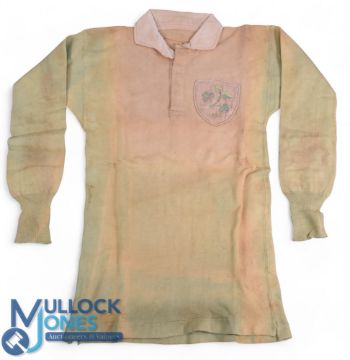 Rare 1926 Ireland Matchworn Rugby Jersey: Faded, as are so many older Irish examples, but historic memorabila from nearly a century back. Originally green, still visible to lower section of reverse and particularly to the silks of the fine large embroidered shamrock badge, four-leaved with 1926 date below. From the collection of the former, later Springbok Philip Nel. VG other than for colour!