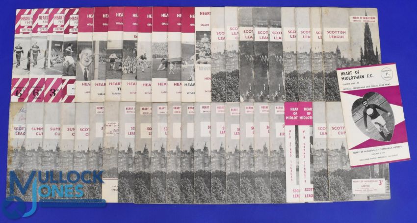 Collection of 1960s Hearts home match programmes 1961/62 Raith Rovers (SLC), St Mirren (SLC), St Johnstone, 1962/63 Aberdeen, Falkirk, Third Lanark, Dundee, Airdrie, Motherwell, Clyde, St Mirren, 1963/64 Hibernian, Airdrie, Falkirk (SLC), Queen of the South, East Stirling, Falkirk, 1964/65 Clyde, Dundee Utd, Aberdeen, Partick Thistle, Morton (SC), Dundee, St Johnstone (autographs to cover), Falkirk (Summer Cup), Hibernian (Summer Cup), Dunfermline (Summer Cup), Morton (SC), 1965/66 Hibernian (SC), Rangers (SLC-handbook edition), Clyde (SC), Rangers (autograph), Celtic, Kilmarnock, St Mirren, Morton, 1966/67 St Mirren (SLC), Clyde (SLC), Dundee, Rangers (2 autographs), Dundee Utd (SC), 1967/68 Raith Rovers, Falkirk, 1969/70 Spurs (challenge match); varied condition, fair at best. (45)
