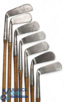 7x Assorted metal blade putters a wry neck musselback of Anderson of Anstruther, flanged sole Spalding gold medal anvil model straight blade, A McCallum of Ayr straight blade, similar stamped W Beecham of Caterham with the anchor brand mark, wry neck stamped James Slack of Matlock, juvenile putter by Martin and Kirkaldy Edinburgh and an R King straight blade with rounded toe - 5x fitted with full length grips