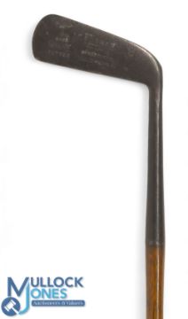 R Forgan giraffe putter showing the green and flag mark, stamped Gold Medal, with 6" hosel fitted with a full length leather grip
