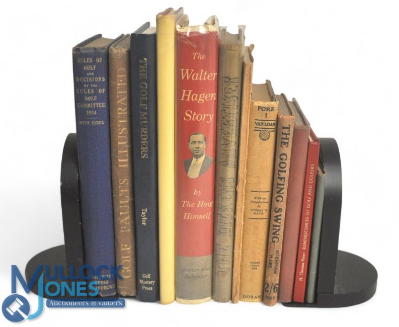 Golf Books: To include Rules of Golf and Decisions 1934, Golf Faults Illustrated, The Golf Murders, A Golfing Idyll, The Walter Hagen Story, The Dickens Advertiser, The Golf Swing, Uncle James Golf Match, Golfing papers, Golf My Way Dai Rees Proof Copy, Golfing Reminiscences by An Old Hand, Fore! By Charles E Van Loan together with Souvenir Programme Percy G Wyatt 1922-1949 (box)
