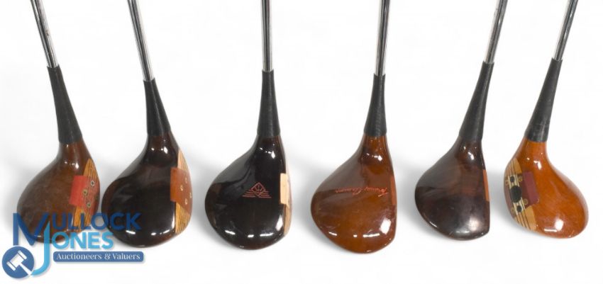 6x Various Persimmon Woods to incl Paul Gibson 5 wood in light stained persimmon, with fancy face insert and sole plate, Harry Busson 1 and 3 woods in dark stained persimmon with face inserts and sole plates, a Mizuno Pro MS-5 5 wood, MacGregor Tourney 1 wood 'Eye-O-Matic M75TW and a Tommy Armour MacGregor Tourney 693 1 wood - all with signs of use - gripped