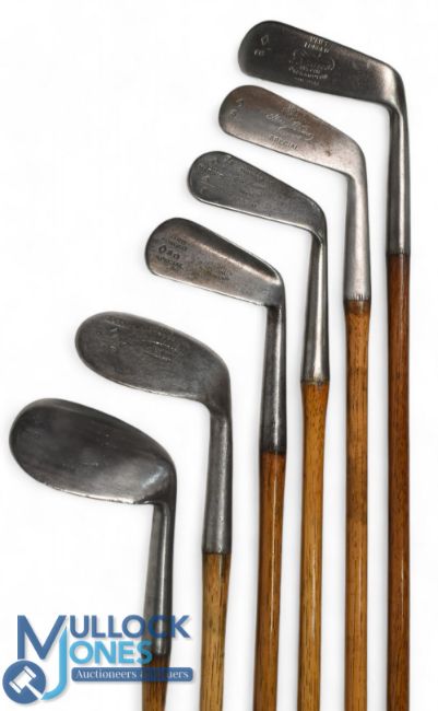 6x Various Winton golf irons features Harry Vardon 3 iron, Ladies 2 iron, a flanged wide sole mashie for F Goldsmith of Minehead, dreadnought niblick and a number 17 niblick, t/w a gooseneck blade putter - all with grips