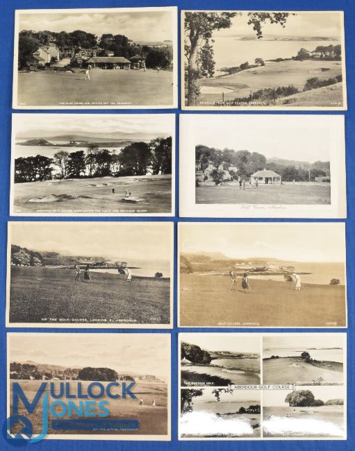 Collection of Aberdour (Est 1896) golf Links real photographs (8) to include The Club House and 1st tee, plus others of Lady and gentlemen players with good views of the course including views of The Forth and Incholm Island - 1x used and dated 1956 - publ'd by J B White Dundee, Valentines, P M Birchall, High St Aberdour, Davidson's Silver Tone Series, A Watson Shore Road Aberdour