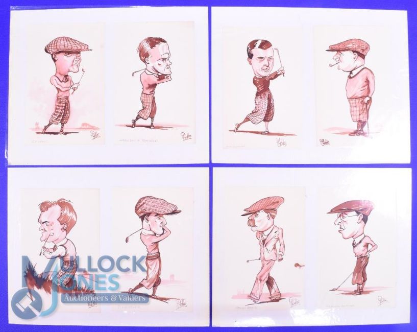 8x Amusing Cartoons of Golfers Peter Hobbs, 1930-1994 Published by the author, Great Britain, 1938 Featuring Golfers W Campbell, R Mackenzie, T H Cotton, Harry Vardon, James Braid, Francis Ouimet, G J Voigt, Harrison R Johnson. Peter Hobbs was a London-based cartoonist active in the 1930s who produced several humorous drawings and watercolours on sporting themes. This work is from a series of cartoons he produced to illustrate "the foibles and perplexities of early golfers. (8)