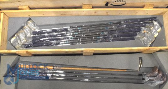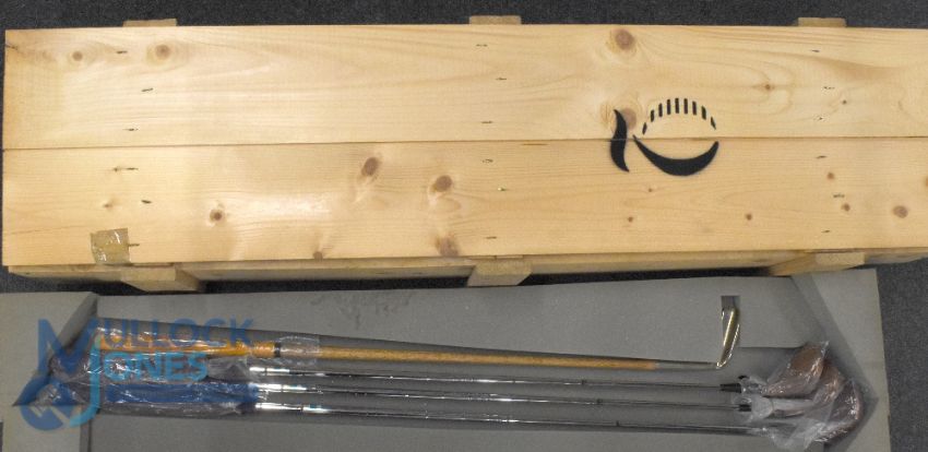 Full Set of limited editions QE2 'Swilken St Andrews' Special Golf Clubs - 3 wood to sand wedge, 1, 3 and 5 wood in persimmon and a flanged putter with hickory shaft, cast from the bronzed propellor blade of the QE2, numbered 0253, with Apollo shafts, blue Swilken grips, all unused within wooden crate