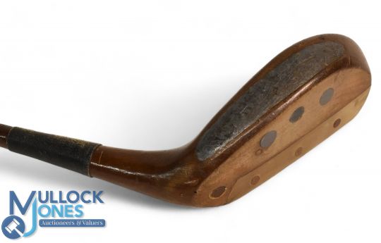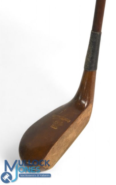 AH Scott of Elie socket neck wooden mallet head putter - showing the Lion above the Crown mark to the crown, with the maker's mark and maker to HM the King stamps to the shaft below the full length replaced leather grip