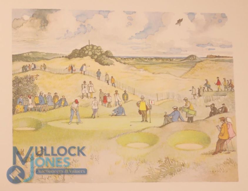 1971 Open Championship Prints in original folder - 100th Open Championship Lee Trevino won the 1971 Open Championship at Royal Birkdale. This title was Trevino's third Major win, and the first of his back-to-back Open Championship wins. It is no wonder, with his 6 Major victories, Trevino is widely considered the greatest Hispanic golfer of all time. Offered here is a collection of commemorative prints in the original folder celebrating the 100th Open Championship played. The prints are all the artwork of J C Armitage "Ionicus". Each print measures 11 1/4" x 14 3/4"