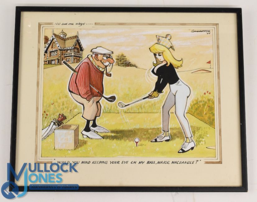Original Seaside Style Humour Golfing watercolour - signed by the artist Greenwood dated 1965 titled 100 and One ways featuring a well-developed young lady golfer …inscribed below "Would you mind keeping your eye on my ball, Major MacDangle?"- image 9.5" x 12" overall 12.25 x 15.5"