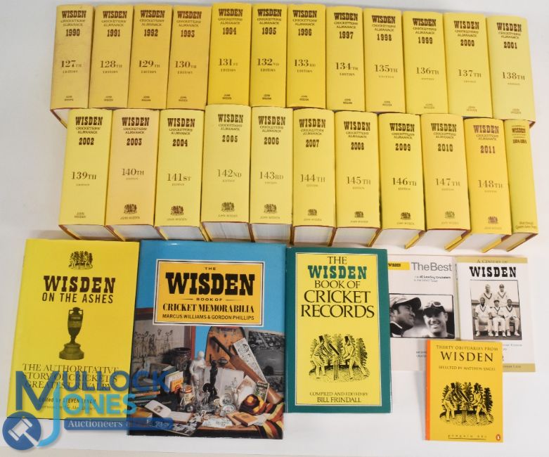 A continuous run of twenty two hardback John Wisden's Cricketers Almanacks 1990-2011 together with a Wisden Cricketers Almanack Index 1864-1984, a Wisden on the Ashes 2009 hardback, the Wisden Book of Cricket Memorabilia 1990, the Wisden Book of Cricket Records 1988, a Wisden The Best 40 Leading Cricketers in the World Today 2002, A Century of Wisden 2000 and Thirty Obituaries From Wisden 1996